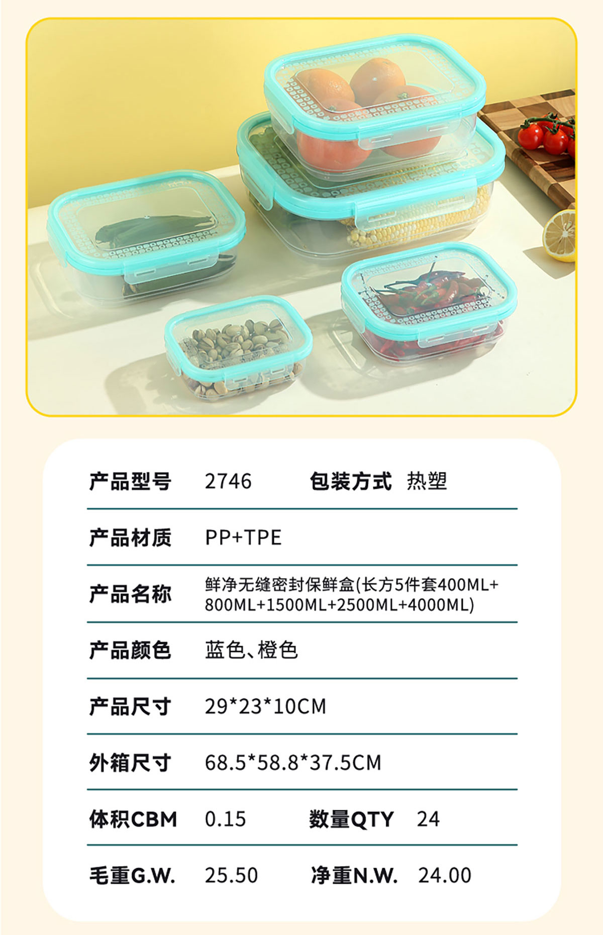 AQX-2746:290*230*100mm/長(zhǎng)方5件套400ml+800mL+1500ml+2500ml+4000ml