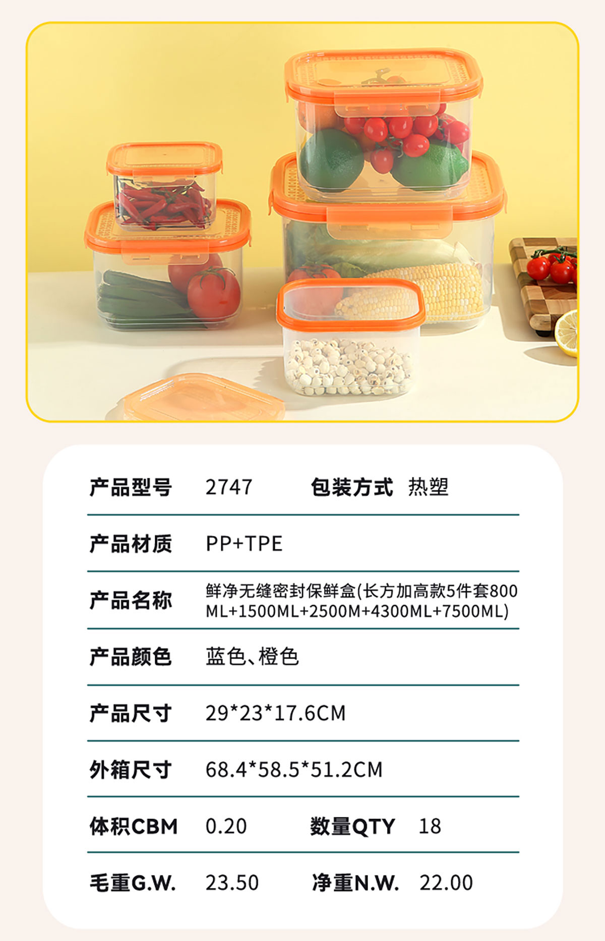 AQX-2747:290*230*176mm/長(zhǎng)方加高款5件套800mL+1500ml+2500ml+4300ml+7500ml