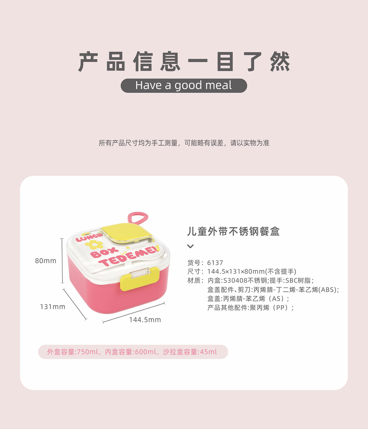 Size: 145*131*80mm/外盒:750ml/內(nèi)盒:600ml/沙拉盒:45ml
